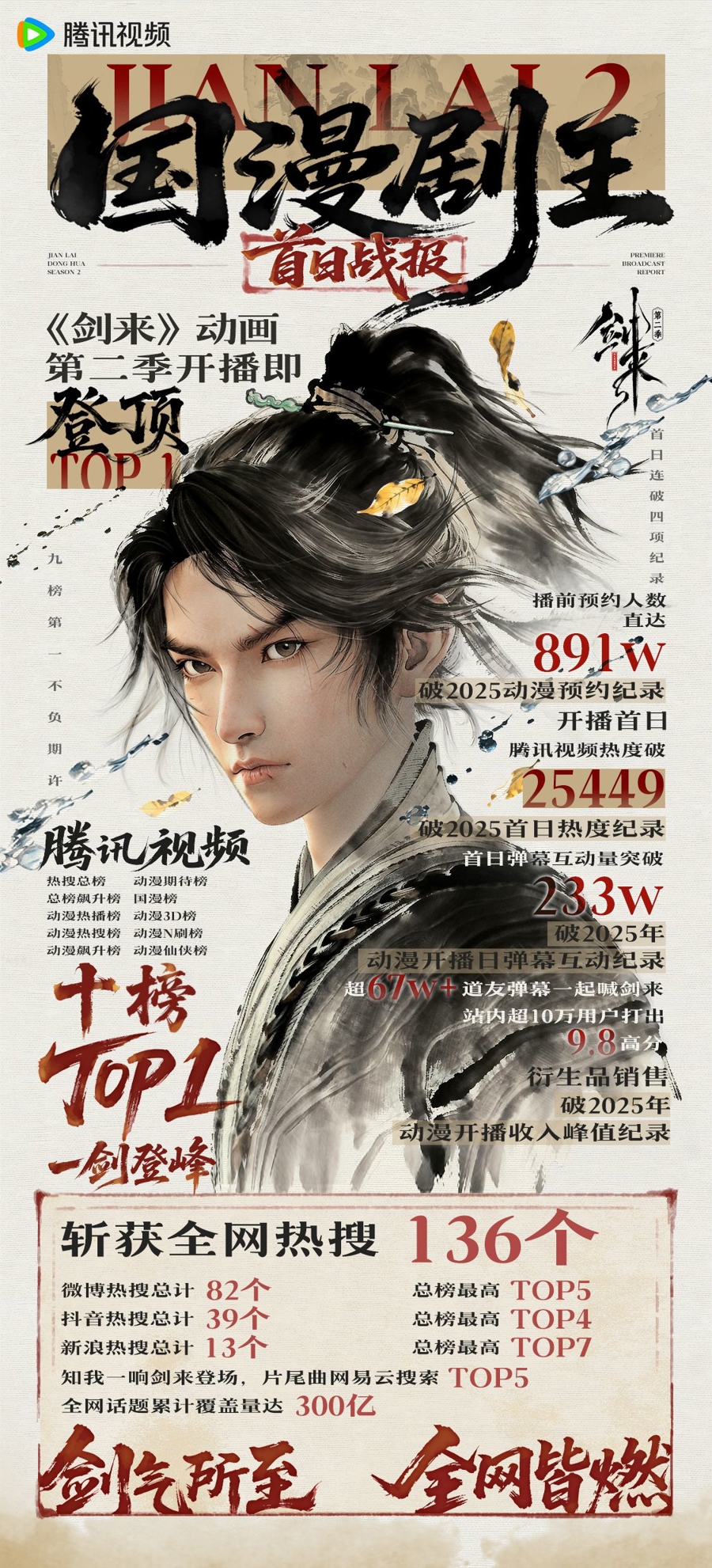 12月25日,《剑来》动画第二季上线,连破多项纪录:腾讯视频站内播前预约人数达891万,创国漫预约人数新纪录;开播仅16分钟站内热度达20000,开播11小时站内热度突破25000,打破2025年动漫热度新纪录。更有近十万人参与站内评分,获9.8高分。